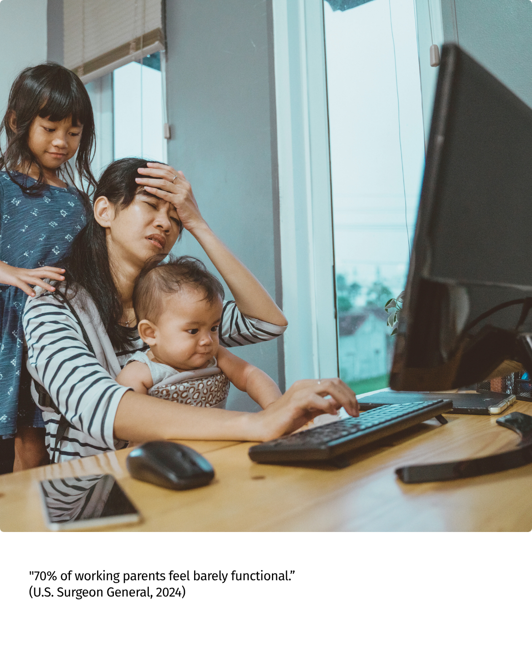 According to the U.S. Surgeon General’s 2024 report, 70% of working parents say they feel “barely functional” under the pressure of managing home and work.